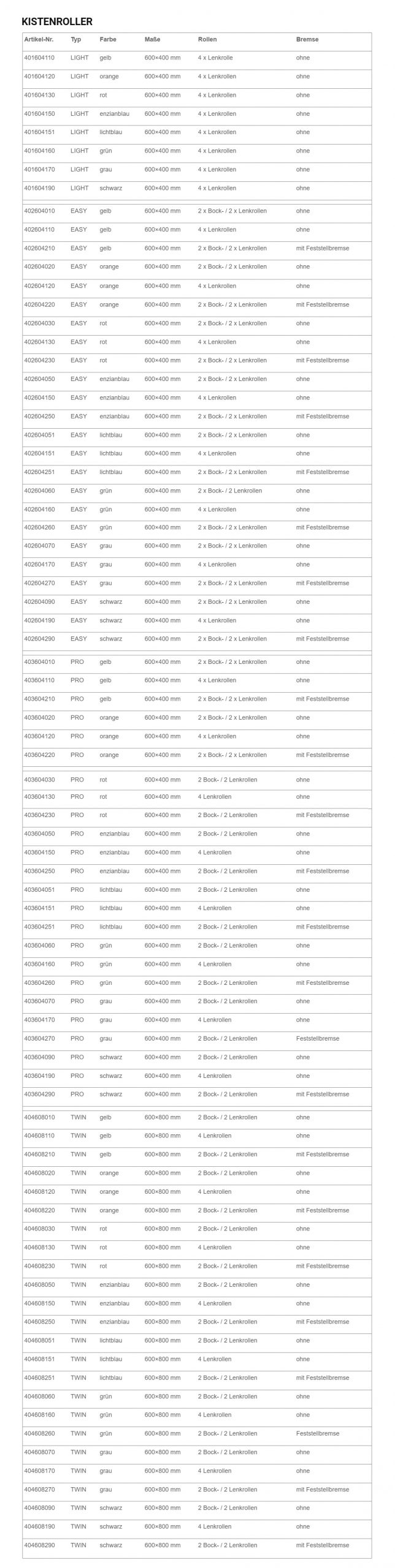 Artikel-Nr. | Typ | Farbe | Maße | Rollen | Bremse |